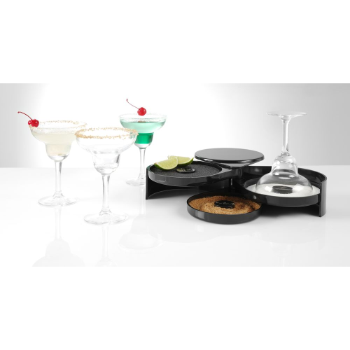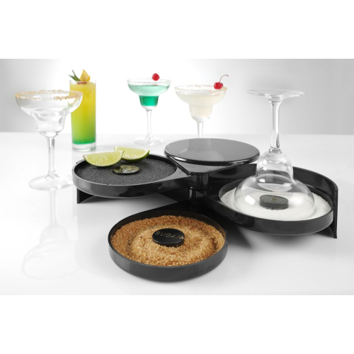 Voor het verfraaien van de randen van glazen. Drie lagen voor limoensap, zout en suiker. Met spons voor het limoensap om morsen te voorkomen.