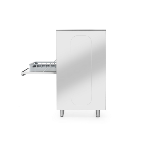 Gespecialiseerde vaatwasser, perfect voor het reinigen van pannen, GN-bakken, oventrays, flessen, dienbladen of bestek. 3 elektronisch gestuurde wascycli: 120s, 180s, 240s. Spoeltemperatuur: 82°C. Wastemperatuur: 60°C. Boilercapaciteit/vermogen: 7,4 L/6 kW. Capaciteit/vermogen wasbak: 58 L/6 kW. Bediening via een aanraakpaneel. Automatisch reinigingssysteem. Dichtheidscoëfficiënt pomp: IP 44. Grote korf: 500x600 mm. Tweelaagse behuizing van AISI 304 roestvast staal. Was- en spoelarmen van roestvast staal. Gewicht: 57kg. APPARATUUR: – Wasmiddeldispenser. – Dispenser voor glansspoelmiddel. – Elektronische thermometer in boiler. – Elektronische thermometer in bassin. - 1,2 kW waspomp. – Afvoerpomp. – Bordenkorf 500x600x(H)105 mm. – Universele korf 500x600x(H)105 mm. – Bestekmand 110x110x(H)130 mm.