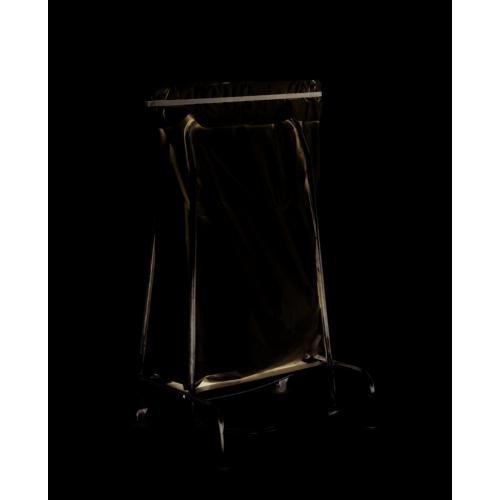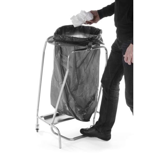 Frame van roestvast staal. Bestemd voor 60x90 cm, 70/80L vuilniszakken. Voetbediend klem mechanisme houdt de zak gesloten. 2 wielen met remmen.