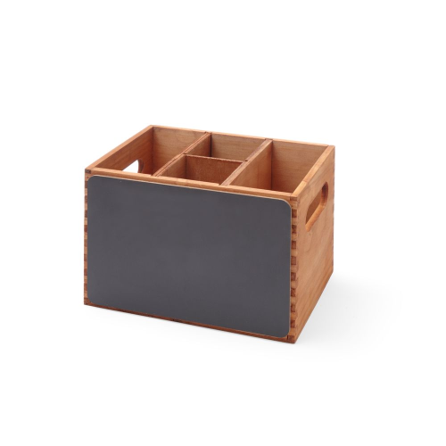 Houten kist met geïntegreerd krijtbord op twee zijden. Kist bevat 4 compartimenten. Accessoires op de foto zijn niet inbegrepen.