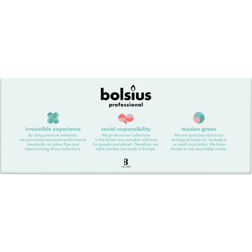 Met de Bolsius Professional kroonkaarsen creëer je makkelijk een gezellige en romantische sfeer. De kaarsen zijn gemaakt voor 7 branduren zodat jij en de gasten er de hele avond van kunnen genieten: van het aperitief tot en met de borrel na het eten. De kaarsen kunnen uiteraard ook zonder probleem op een ander moment opnieuw worden aangestoken. Dankzij de premium kwaliteit, mooie en rustige vlam, gelijkmatige verbranding, kies je met Bolsius Professional tafelkaarsen voor het beste resultaat. De ribvoet aan de kaarrs zorgt dat deze altijd perfect in de kandelaar past.