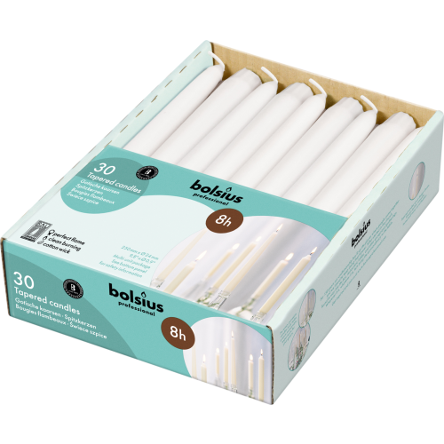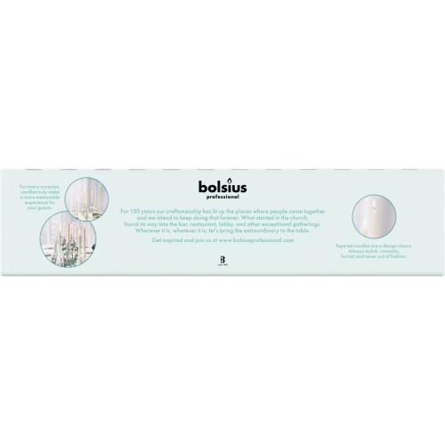 Met de Bolsius Professional kroonkaarsen creëer je makkelijk een gezellige en romantische sfeer. De kaarsen zijn gemaakt voor 8 branduren zodat jij en de gasten er de hele avond van kunnen genieten: van het aperitief tot en met de borrel na het eten. De kaarsen kunnen uiteraard ook zonder probleem op een ander moment opnieuw worden aangestoken. Dankzij de premium kwaliteit, mooie en rustige vlam, gelijkmatige verbranding, kies je met Bolsius Professional tafelkaarsen voor het beste resultaat. De ribvoet aan de kaarrs zorgt dat deze altijd perfect in de kandelaar past.