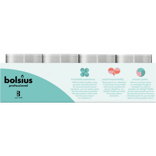 Deze Bolsius Professional ReLight navulling is leverbaar in maar liefst 11 kleuren, past in alle reguliere Relight houders. Veilig, schoon, geurloos en makkelijk in gebruik in combinatie met een lange brandtijd van 24 uur maken dit tot een favoriet voor professioneel gebruik. Met een mooie grote vlam zorgt deze kaars voor avonden vol sfeerverlichting. De polycarbonaat cup is gemaakt van gerecycled materiaal en is recyclebaar. De vlam is van begin tot eind van de brandtijd zichtbaar, en iedere keer makkelijk opnieuw aan te steken. Met de ruime keuze in kleuren, is er altijd een variant die past bij uw zaak, of het seizoen.