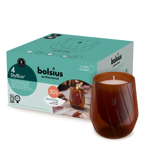 Stijl, gemak en duurzaamheid komen samen in het StylEco® concept van Bolsius Professional. Dit is het eerste navulconcept voor tafelkaarsen dat geen plastic bevat en maar liefst 50 branduren oplevert. Eenmaal gebruikt blijft alleen het pitplaatje over. Na gebruik haal je hem uit het lege glas en plaats je eenvoudig een nieuwe vulling.