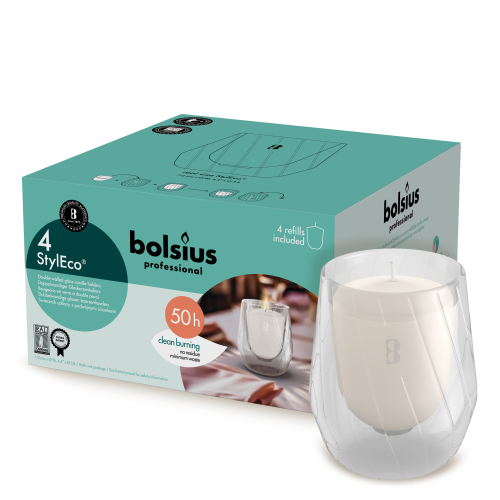 Stijl, gemak en duurzaamheid komen samen in het StylEco® concept van Bolsius Professional. Dit is het eerste navulconcept voor tafelkaarsen dat geen plastic bevat en maar liefst 50 branduren oplevert. Eenmaal gebruikt blijft alleen het pitplaatje over. Na gebruik haal je hem uit het lege glas en plaats je eenvoudig een nieuwe vulling.