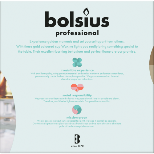 Met de Bolsius Professional waxinelichten creëer je makkelijk een gezellige en romantische sfeer. De kaarsen zijn gemaakt voor 6 branduren zodat je er een hele avond van kan genieten: van het aperitief tot en met de borrel na het eten. De waxinelichten kunnen uiteraard ook zonder probleem op een ander moment opnieuw worden aangestoken. Dankzij de premium kwaliteit, mooie en rustige vlam, gelijkmatige verbranding en het minimale residu in de gouden aluminium cup, kies je met Bolsius Professional theelichten voor het beste theelicht.
