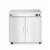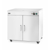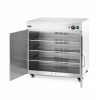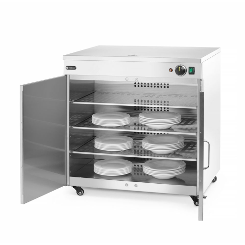 Behuizing, planken en verwarmingselementen van roestvast staal. Geschikt voor ca. 108 borden van Ø24 cm (of 64 pizzaborden van Ø33 cm). Met 3 verwijderbare, niet-verstelbare planken: 680x340x(H)10 mm. Afstand tussen planken: 120 mm. Temperatuur instelbaar van 30°C tot 85°C. Uitgerust met een ventilator om een gelijkmatige temperatuur in de gehele kamer te garanderen. Deur met magnetische sluiting. Aan/uit-schakelaar met indicatielampjes. Voorzien van 4 wielen, waarvan 2 met rem. *De verstrekte cijfers zijn algemene indicaties en kunnen variëren afhankelijk van de grootte, lengte en het gewicht van de gebruikte borden.