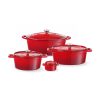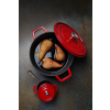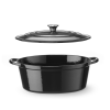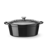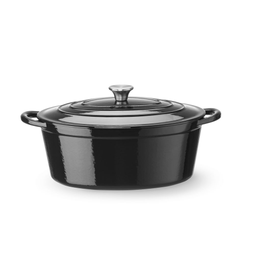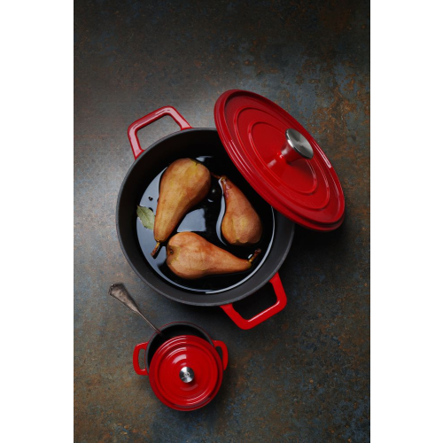 Gemaakt van gietijzer met emaillen coating aan de buitenkant. Deksel met bultjes aan de binnenkant die waterdruppels (stoom) dwingen om terug te vallen, waardoor het gerecht vochtig en aromatisch blijft. Geschikt voor alle warmtebronnen, inclusief inductie. Niet vaatwasmachinebestendig. Verkrijgbaar in verschillende maten; de kleinste kan worden gebruikt als serveerschaal (code: 626856, 626894).