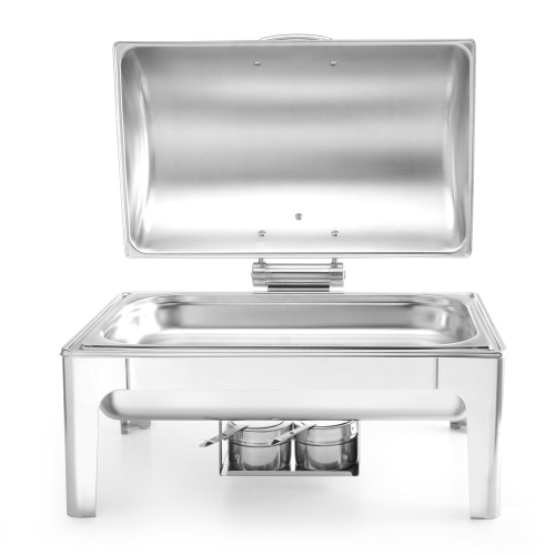 De deksel is voorzien van een frictierem en kan daardoor in elke gewenste positie geplaatst worden. De deksel kan worden verwijderd om het schoonmaken te vergemakkelijken. Wordt geleverd met verwijderbare waterpan, GN 1/1 65 mm diepe voedselpan en 2 brandpastahouders.