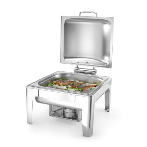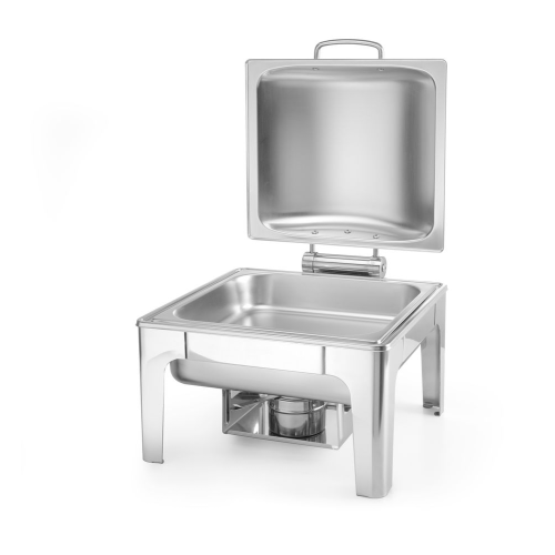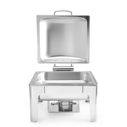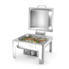 De deksel is voorzien van een frictierem en kan daardoor in elke gewenste positie geplaatst worden. De deksel kan worden verwijderd om het schoonmaken te vergemakkelijken. Wordt geleverd met verwijderbare waterpan, GN 2/3 65 mm diepe voedselpan en brandpastahouder.