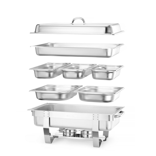 Bestaande uit: Chafing Dish “Fiora” als 471005, 2 extra bakken GN 1/2 65 mm diep en 3 extra pannen GN 1/3 65 mm diep.