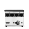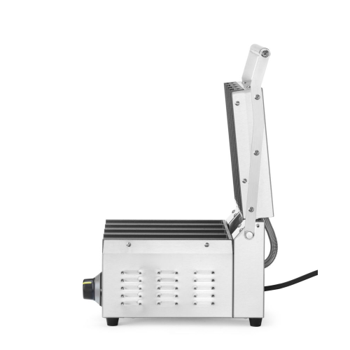 Behuizing gemaakt van duurzaam roestvast staal. Ontworpen voor snel en gelijkmatig roosteren en grillen van 4 Franse hotdogbroodjes, panini's en wraps tegelijk. Verwarmingsoppervlak: 270 × 250 mm – maakt gelijktijdige bereiding van 4 broodjes mogelijk. Hoogwaardige verwarmingselementen (220~240V/1800 W) – snelle opwarmtijd. Instelbare temperatuurregeling van 50 °C tot 300 °C (schaalverdeling in stappen van 50 °C) zorgt voor optimale omstandigheden voor het verwarmen en grillen van broodjes. Speciaal gevormde, geëmailleerde gietijzeren verwarmingsplaten – zorgen voor gelijkmatige bruining en een aantrekkelijk resultaat. Uniek plaatontwerp maakt het mogelijk om broodjes van verschillende formaten te roosteren zonder ze tijdens het proces te hoeven draaien. Grilleffect verbetert zowel het uiterlijk als de smaak van de geroosterde broodjes. Eenvoudig te reinigen dankzij het geëmailleerde oppervlak, wat zorgt voor hygiëne met minimaal onderhoud. Scharnierend deksel opent tot 90°. Voorzien van een handgreep die koel blijft. Ruimte om 4 broodjes tegelijk te roosteren. LED-lampjes geven aan wanneer het apparaat is ingeschakeld en aan het verwarmen is. Vier antislipvoeten zorgen voor stabiliteit en voorkomen dat het apparaat tijdens gebruik verschuift.