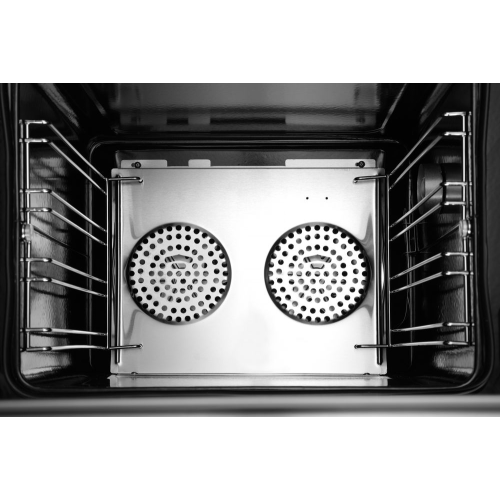 Behuizing van roestvast staal. Coul-touch, dubbelglas deur die verwijderbaar is voor eenvoudige reiniging. Gedeeltelijk geëmailleerde kamer met binnenverlichting. Verwarming door middel van 2 verwarmingselementen en 2 ventilatoren. Temperatuur instelbaar van 50°C tot 300°C. Timer: 0-120 min. Geschikt voor 4 437x314 mm trays. Geleiders met een tussenafstand van 70 mm. Geleverd met 4 trays. Onderstel: 223468.