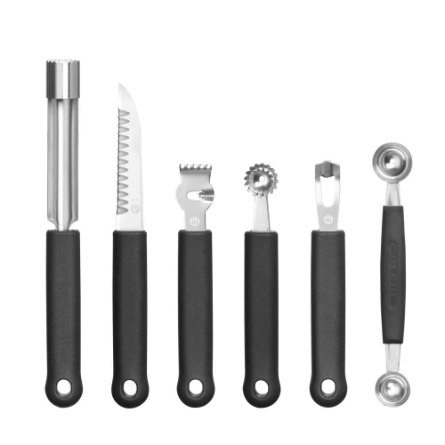 Foudraal met: - Fruit bolletjeslepel dubbel - Fruitboor 20 mm - Decoratiemesje - Fruit bolletjeslepel gekarteld - Citroen/sambal trekker - Kanaalmes.