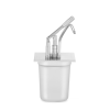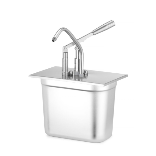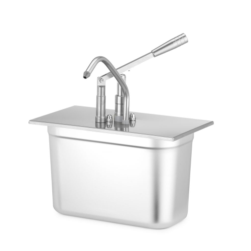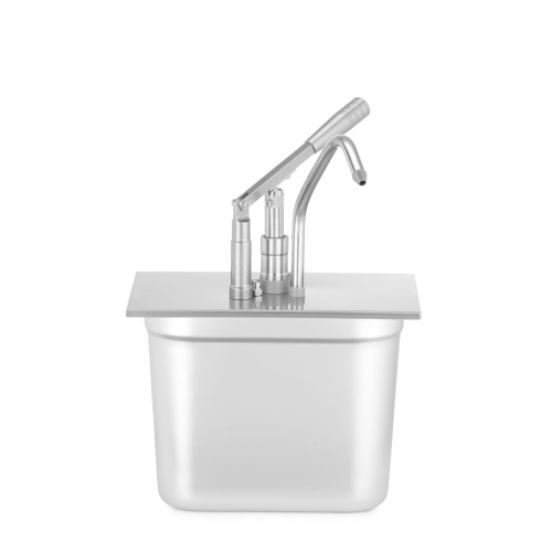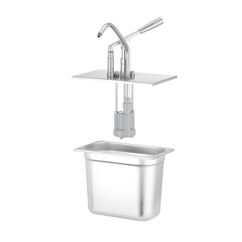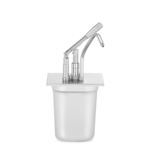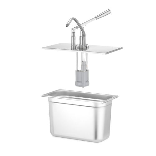 Behuizing, veer in de dispenser en pompsysteem gemaakt van 18/8 roestvast staal. Het onderste element van de dispenser is gemaakt van polypropyleen. Deksel en dispenserpomp verwijderbaar. Portie volume: 30 ml Niet vaatwasmachinebestendig. 3 maten verkrijgbaar: GN 1/6 (code: 558133) GN 1/4 (code: 558140) GN 1/3 (code: 558157) Geschikt voor GN -containers met een hoogte van 200 mm (niet inbegrepen).