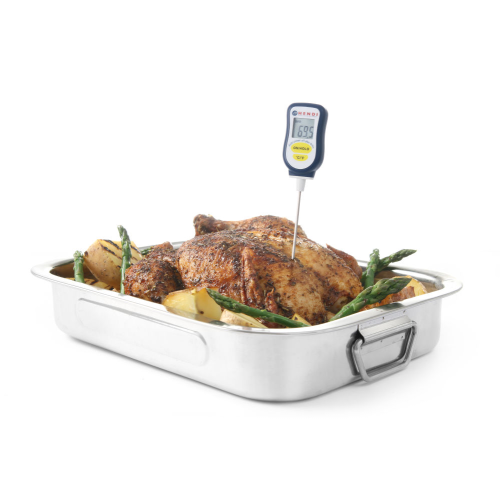 Geeft snel en accuraat de temperatuur weer. IP65 waterdicht. Meetbereik –50°C tot 350°C, meeteenheid: °C of °F. Gradatie 0,1°C, nauwkeurigheid ±0,8%/0,8°C. “Hold” functie om de gemeten temperatuur vast te houden op het scherm. 130 mm lange roestvast stalen sonde. Schakelt automatisch uit. Met sonde beschermhoes. Batterij inbegrepen.