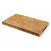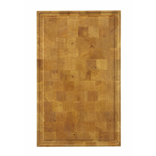 Dubbelzijdig. Gemaakt met de kopse kantmethode: eiken vierkanten worden in een stijlvol schaakbordpatroon aan elkaar gelijmd. Verticale plaatsing van houtvezels, loodrecht op het werkoppervlak – verhoogde duurzaamheid, bestand tegen krassen en voorkomt bot worden van messen (mes gaat tussen houtvezels).