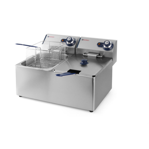 Met 2 verwarmingselementen van elk 3500W. Elk element heeft zijn eigen stekker, er zijn dus 2 stopcontacten nodig. Behuizing en olietank van roestvast staal. Voorzien van een uitneembaar element met uitschakelfunctie bij het verwijderen. De vetpan is eveneens uitneembaar wat het reinigen vergemakkelijkt. Overzichtelijke bediening met controlelampje voor de temperatuur. Temperatuur instelbaar tot 190°C. Een maximaalthermostaat zorgt voor de beveiliging tegen oververhitting welke middels de reset knop aan de onderzijde van het elementdeel weer is in te schakelen. Een frituurmand met een extra lange handgreep maakt dit model tot een prettig apparaat voor intensief gebruik. Koude zone beschermt de oliekwaliteit. Inclusief frituurmandje en deksel.
