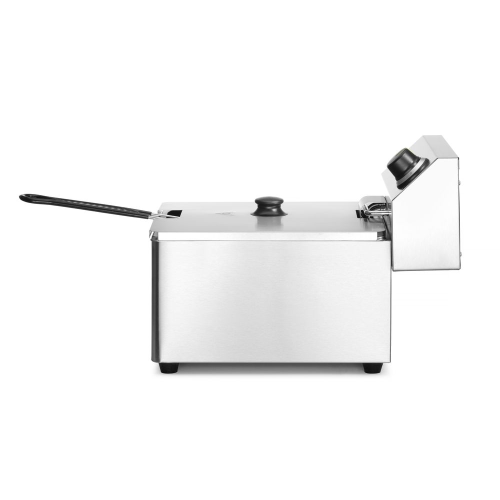 Behuizing en olietank van roestvast staal. Voorzien van een uitneembaar element met uitschakelfunctie bij het verwijderen. De vetpan is eveneens uitneembaar wat het reinigen vergemakkelijkt. Overzichtelijke bediening met controlelampje voor de temperatuur. Temperatuur instelbaar tot 190°C. Een maximaalthermostaat zorgt voor de beveiliging tegen oververhitting welke middels de reset knop aan de onderzijde van het elementdeel weer is in te schakelen. Een frituurmand met een extra lange handgreep maakt dit model tot een prettig apparaat voor intensief gebruik. Koude zone beschermt de oliekwaliteit. Inclusief frituurmandje en deksel.