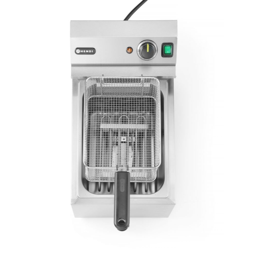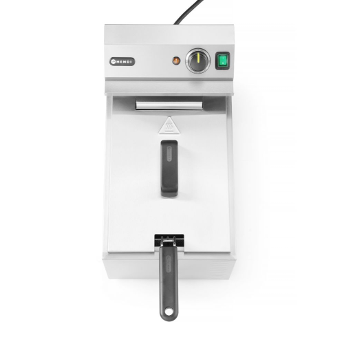 Friteuse met het hoogste vermogen op de markt in zijn capaciteitsbereik – HENDI GOLIATH heeft een vermogen van 10.200 W. Bereidt tot 1 kg friet in ongeveer 3 minuten - dankzij het extreem efficiënte, extra sterke verwarmingselement. Zeer snelle opwarming van olie: ongeveer 5 minuten (afhankelijk van de omgevingsomstandigheden). De behuizing, tank en deksel zijn gemaakt van roestvast staal dat bestand is tegen hoge temperaturen. Ruime tank van 10 liter met een V-vorm bodem – nog efficiëntere "koude" zone die de prestaties van de friteuse verbetert. De set bevat een zeer stevige frituurmand met afmetingen: 290x200x(H)142 mm, gemaakt van vernikkeld staaldraad. De mand is uitgerust met een lange, koel blijvend, handvat – 162 mm. Steun voor het veilig plaatsen van de frituurmand in de tank. Hoogwaardige thermostaat van de Duitse fabrikant EGO, met een controlelampje dat de werking van het verwarmingselement aangeeft. Verwijderbare regeleenheid en verwarmingselement, met ingebouwde bescherming die het apparaat uitschakelt wanneer het apparaat wordt opgetild. Temperatuurbereik: 50°C tot 190°C. Min. en max. olieniveau-indicatoren in de tank. Kraan voor eenvoudig legen van het oliereservoir. Bescherming tegen oververhitting door middel van een resetbare thermische zekering. OPMERKING: Installatie door een elektricien is vereist – het apparaat wordt zonder stekker geleverd.