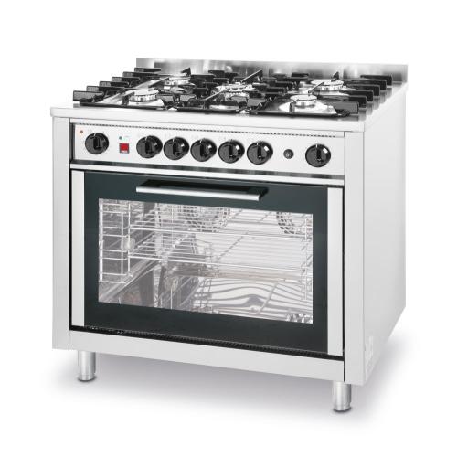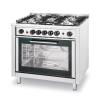 Geschikt voor aardgas. 3 branders van 3.0 kW. 1 spaarbrander van 1.8 kW. 1 wokbrander van 3.5 kW. Piëzo-electrische ontsteking en thermokoppels. Gietijzeren pandragers in drie delen. Heteluchtoven 1/1 GN met een vermogen van 2.7 kW voorzien van twee ventilatoren, thermostaatknop tot 275°C en tijdklok. Inclusief 2 rooster. Extra bovenelement van 2.5 kW voor grillfunctie. Roestvast stalen ovenruimte en binnenzijde deur. Gewicht: 78 kg.