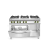 Gemaakt van roestvast staal. Uitgerust met 6 branders: - 3 branders van 6,0 kW - 3 branders van 3,5 kW Branders zijn uitgerust met thermokoppel. Geschikt voor pannen van ø 120 tot 300 mm. Pannendragers en branders gemaakt van gietijzer. In hoogte verstelbare poten voorzien van antislippoten. Geschikt voor aardgas, conversieset voor LPG inbegrepen. Opmerking: Geen waakvlam of ontsteking, moet worden aangestoken met lucifers of aansteker.