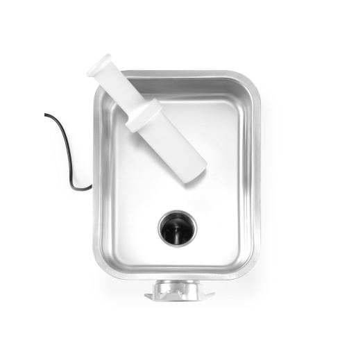 Behuizing gemaakt van aluminiumlegering. Invoerbak gemaakt van roestvast staal. Doorvoerschacht gemaakt van aluminiumlegering. Mes en wormschroef gemaakt van roestvast staal. Trechter gemaakt van gietijzer. Stamper gemaakt van polyethyleen. Motor met een oververhittingsbeveiliging en een resetknop tegen overbelasting. Rotatiesnelheid: 170 tpm (toeren per minuut). Antislipvoetjes. Eenvoudige demontage voor reiniging. Productiecapaciteit≈ 100 kg/h. Kan tot 45 minuten achter elkaar gebruikt worden, daarna 15 minuten afkoelen. Inbegrepen: 1x Worstenvulbuis gemaakt van polypropyleen. 2x Ø 70 mm geperforeerde platen met Ø 6 en 8 mm gaten inbegrepen.
