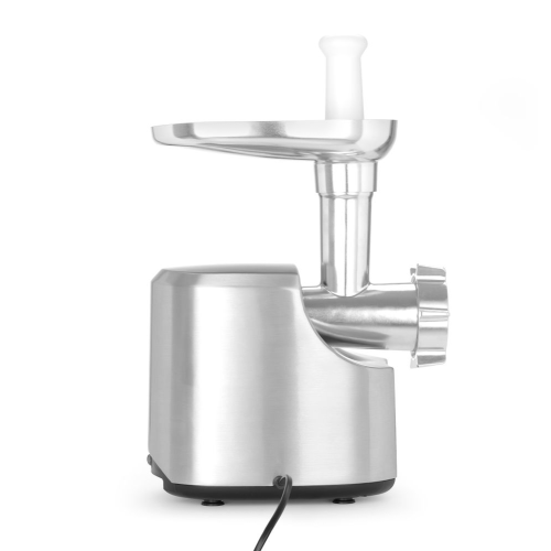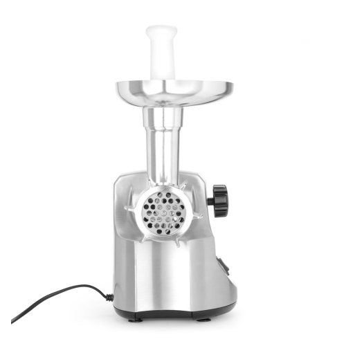 Ideaal voor kleine hoeveelheden en worsten maken, niet voor professioneel gebruik. Aluminium behuizing. Gietijzeren invoerbak met vleeshouder en stofdeksel. Stamper van plastic. Aluminium wormschroef en roestvaststalen mes. Inclusief 2 platen ø65,8 mm: 4 mm en 7 mm perforaties. 3 vultrechters voor worsten: ø12, 15 en 20 mm. Filet. Americain accessoire. Aan/uit/achteruit schakelaar. Niet voor continu gebruik. Gewicht 5,2 kg.