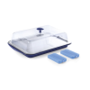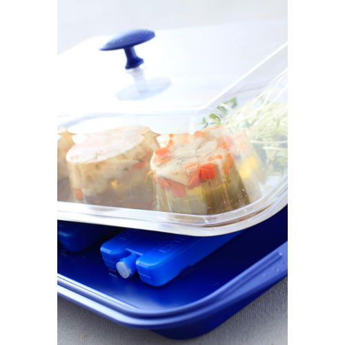 5-delige set: Basis gemaakt van polystyreen. Schaal van roestvast staal, met een geprofileerde rand. Transparante deksel gemaakt van polystyreen. 2 koelelementen. OPMERKING: Vul het koelelement voor het invriezen met water tot 90% van het volume. De tray wordt ook apart verkocht (code: 871829).