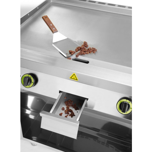 Grillplaat gemaakt van S355J2 glad staal. Basis gemaakt van 18/0 roestvrij staal. Twee afzonderlijk regelbare verwarmingszones, elk voorzien van drie roestvaststalen, buisvormige multiramp-branders. Gasvermogen van 1 verwarmingszone: 5 kW. Temperatuurregeling via een thermokoppel met veiligheidsklep die de gastoevoer naar de branders afsluit wanneer de vlam uitgaat. Elektrische ontsteker – aansluiting op 230 V-voeding vereist. De kookplaat is licht naar voren gekanteld. Voorzien van een opening en een uitschuifbare lade. 380 mm hoog. Het apparaat is standaard voorzien van NG50 (G30) gasinspuiters. Inbegrepen: Inspuiters geschikt voor LPG-gasflessen Gasaansluiting linksachter, op ca. 550 mm. Stalen voetjes verstelbaar: 100 tot 165 mm.