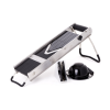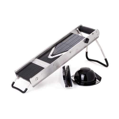 Gemaakt van roestvast staal en zwart. ABS. V-vorm primair mes, gegolfd secundair mes. Snijdikte makkelijk aanpasbaar bij beide messen. Opvouwbaar onderstel met rubberen voet. Komt met twee extra messen voor julienne en friet, 6 of 9 mm breed. Met opbergbox voor de extra messen. Polypropyleen producthouder met metalen pinnen.