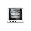 Biedt plaats aan 4 trays 429 x 345 mm, 4 trays inbegrepen. Eén niet-omkeerbare ventilator. Behuizing en ovenkamer gemaakt van roestvast staal. Dubbellaagse glazen deur, koelt het voorste paneel d.m.v. natuurlijke convectie. Tussenruimte liggers 74 mm