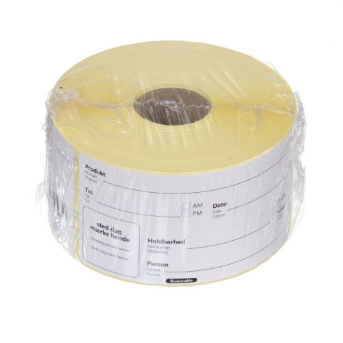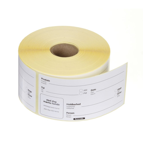 Ruimte voor datum, tijd en aanvullende opmerkingen. Aantal stickers per rol: 500. Label in 3 talen: Deens, Noors en Zweeds.