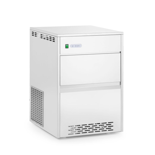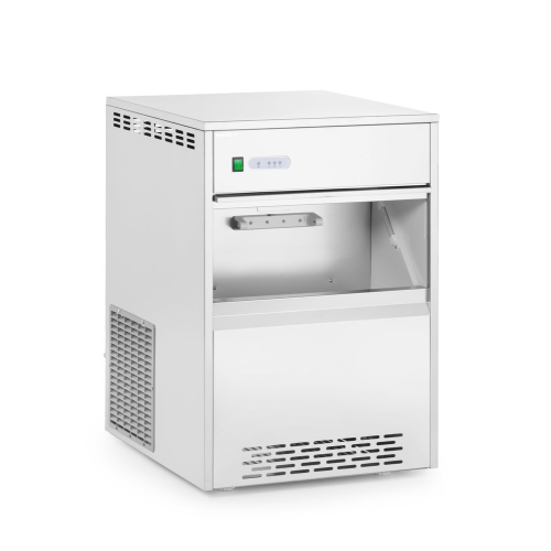 Behuizing van roestvast staal. Produceert vlokkenijs (Ice Flake). Kan tot 20 kg ijs opslaan. Uitgerust met blauw LED-lampje. Inclusief inlaat- en uitlaatslangen en ijsschep.