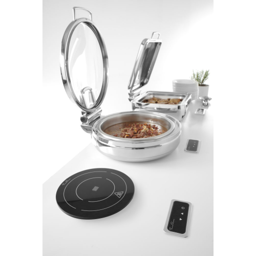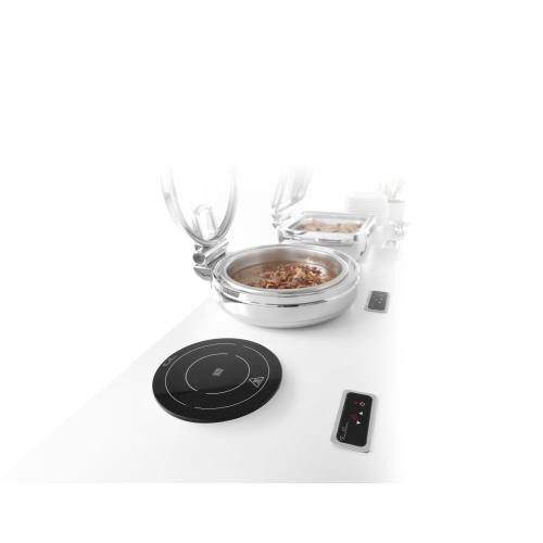 Zwart kristalglazen oppervlak en kunststof behuizing. Vermogensregeling instelbaar in 10 stappen, voorzien van elektronische oververhittingsbeveiliging. Bedieningspaneel met LED-display en aanraakbediening, kan verzonken worden gemonteerd. Geschikt voor gebruik met bepaalde chafing dishes, controleer of uw chafing dish geschikt is. Ook geschikt voor inbouw met de afzonderlijk verkrijgbare ring (239186).