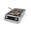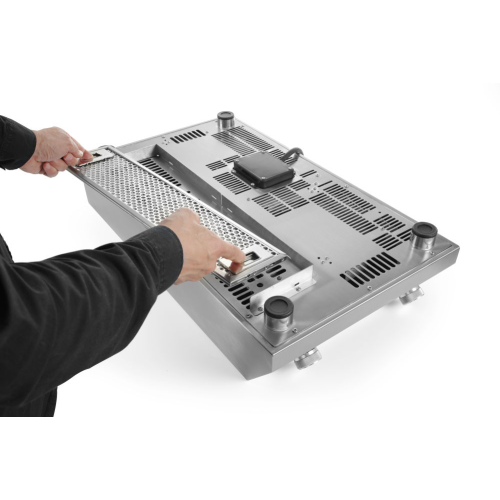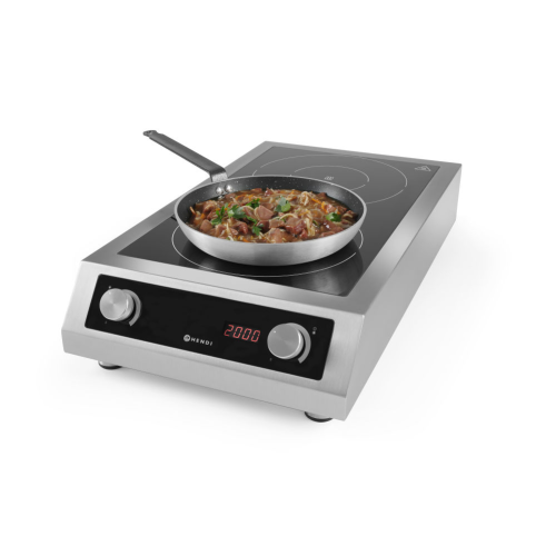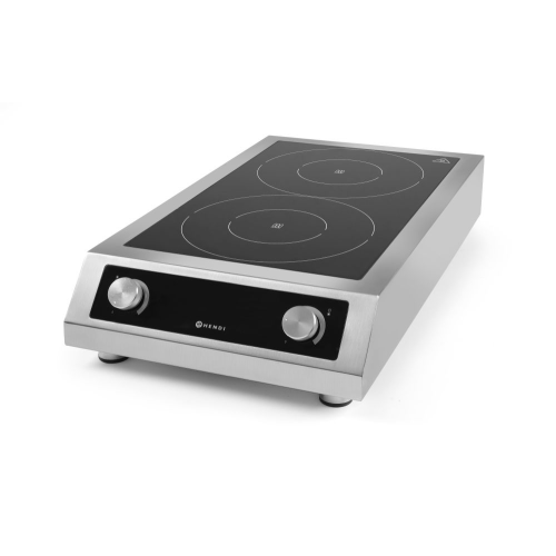 Behuizing van roestvast staal met 2 kookzones. De voorste kookzone heeft een maximaal vermogen van 5000W, wanneer deze is ingesteld op 5000W kan de achterste kookzone enkel 2000W leveren. Achterste kookzone heeft een maximaal vermogen van 3500W, alleen als de voorste kookzone niet boven 3500W is ingesteld. Elektronische bescherming tegen oververhitting. Met verstelbare metalen voetjes en een verwijderbaar luchtfilter. Werkt op 380V, wordt geleverd zonder stekker, elektricien vereist voor het aansluiten. Geschikt voor pannen met een bodemmaat van minimaal ø140 mm tot ø280 mm. Toegestane maximale belasting van de kookplaat: 20+20 kg.