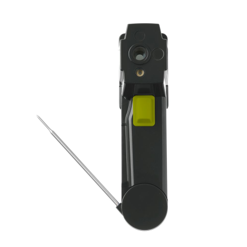 Temperatuur wordt gemeten door middel van infrarood of de inklapbare sonde. HACCP controlelampje om in 1 oogopslag wel/niet voedselveilige temperaturen te herkennen. Met 90 mm lange inklapbare sonde van roestvast staal. Meetbereik -60°C to 350°C. Gradatie 0,2˚C. Infrarood meetbereik: -60/65°C ≈1°C, 65/350°C ≈1.5%. Sonde meetbereik: -60/-5°C ≈1°C, -5/65°C ≈0.5°C, 65/350°C ≈1%. Afstand spot ratio 8:1. Schakelt automatisch uit na 15 seconden. Batterijen 2xAAA (niet inbegrepen).