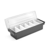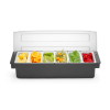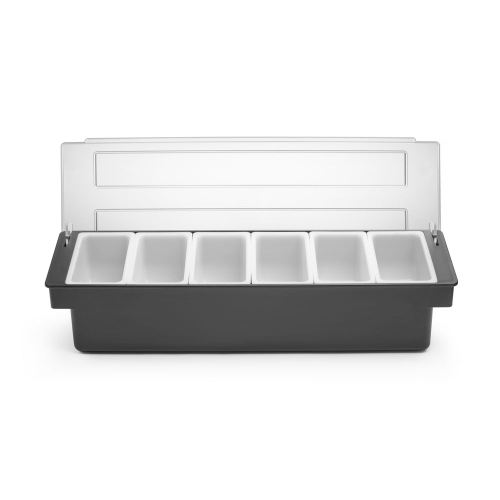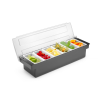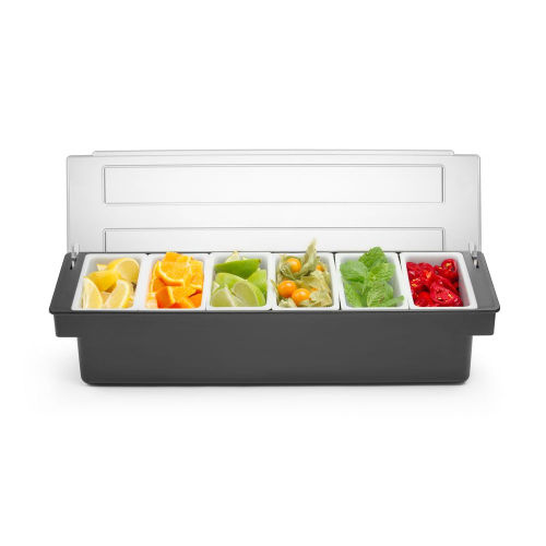 Voor gebruik in bars, pubs en restaurants Gemaakt van premium plastic HIPS-behuizing en transparant ABS-deksel om voedsel te beschermen tegen besmetting of insecten 6 polypropyleen containers voor het afzonderlijk opslaan van fruit- of kruidenadditieven Elke container kan eenvoudig uit de houder worden verwijderd, bijv. om het product aan te vullen Vaatwasserbestendige containers