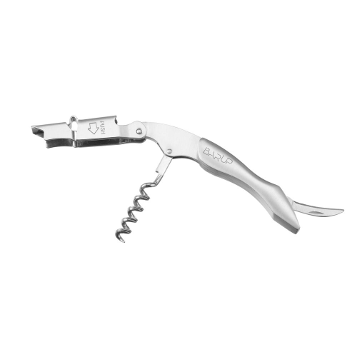 Gemaakt van roestvast staal. 3 functies: foliesnijdend blad, klassieke kurkentrekker en een flesopener. Met handvat. Niet vaatwasmachinebestendig.