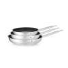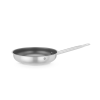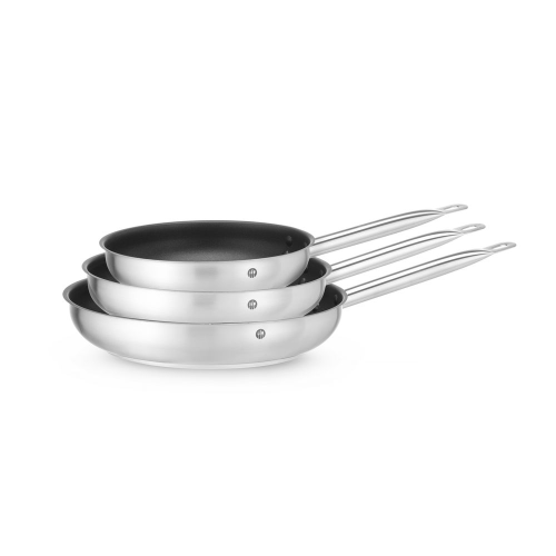 Anti-aanbaklaag. Lange, koelblijvende handgreep van roestvast staal. Handgreep bevestigd met klinknagels.