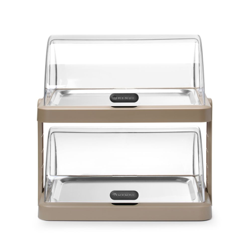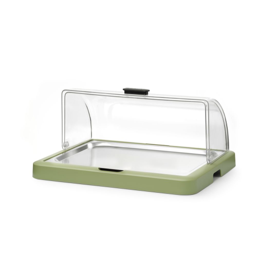 Behuizing gemaakt van ABS. Transparante rolltop-deksel van PET maakt het mogelijk om voedsel te kiezen zonder het deksel op te tillen. Het deksel kan tot 90 graden worden geopend. Handige handgreep voor het openen van het deksel. Inclusief roestvaststalen trays (400x300 mm) en met gel gevulde koelelementen. Uitsparing in de behuizing maakt het eenvoudig om de tray vast te pakken en te verwijderen. Geschikt voor gerechten die een lagere temperatuur vereisen. Snelle montage en demontage zorgen voor eenvoudig hygiëneonderhoud. Verkrijgbaar in 2 modellen: enkel en dubbel. Enkele "Duo” bevat: 1 tray, 2 met gel gevulde koelelementen en 1 display met rolltop. Dubbele “Duo” bevat: 2 trays, 4 met gel gevulde koelelementen en 2 displays met rolltop. Verkrijgbaar in 3 kleuren die passen bij andere producten van de UNIQ-collectie: zwart, groen, beige.