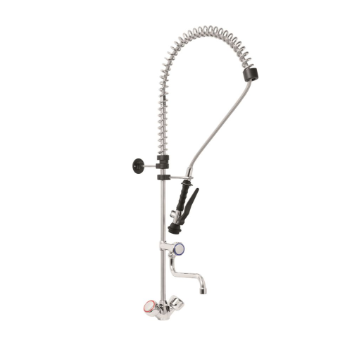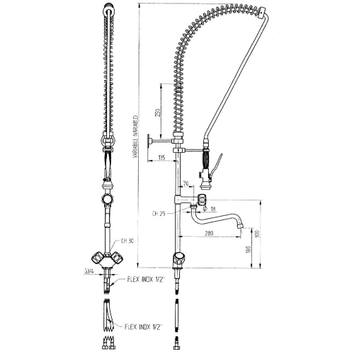 Pilaarkraan met 1 opening. Voorspoeldouche geschikt voor water onder hoge druk. Voorspoeldouche met behuizing van plastic. Verstelbare steun. Muurbevestiging (inkortbaar). Aansluitingen: 1/2” Kraan gat vereist: ø30 mm. Bereik: 280 mm.