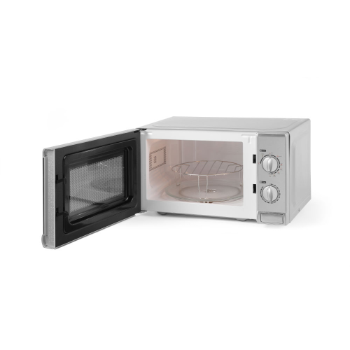Roestvaststalen behuizing en frontpaneel. Eenvoudig af te lezen bedieningspaneel. Bediening met twee knoppen om de tijd en het vermogen aan te passen - 9 niveaus. De roterende magnetronantenne bovenin zorgt voor een gelijkmatige verdeling van de energie. Ingebouwd luchtfilter ter bescherming tegen vet en stof. Deur met venster om de voortgang in het verlichte interieur van de magnetron te volgen. Te openen met drukknop voor eenvoudige bediening. Kamer interieur: – afmetingen 275x260x(H)173 mm, inhoud 20 l. – wit geverfd. – makkelijk schoon te maken. – het breken van borden wordt voorkomen dankzij de afgeronde randen. Multifunctioneel gebruik: – ontdooien. – 4 niveaus van magnetronvermogen: laag, gemiddeld, gemiddeld hoog, hoog. – functie voor het combineren van standaard- en grillmodus: Combi (3 niveaus). – grill (vermogen 1000 W). – het einde van de kookcyclus wordt aangegeven door een alarm. Magnetronvermogen: 700 W. Inclusief glazen draaiplateau van 255 mm en grillstandaard. Geschikt voor ronde borden (tot ø255 mm). Maximale insteltijd: 35 minuten. Voorzien van een kabel met een geaarde stekker. Gewicht: 11,1 kg.