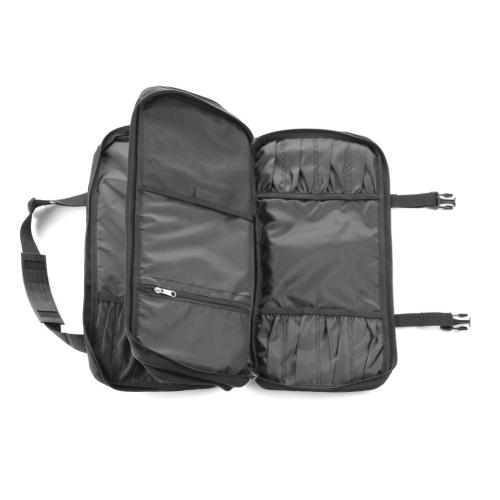Compacte tas met 17 sleuven. Geschikt voor 4 messen met een maximum lengte van 450 mm en 13 kleinere gereedschappen. Scheiding tussen sleuven versterkt met plastic. Messen en gereedschappen worden gezekerd door elastiek. Uitgevouwen afmetingen: 500x510 mm. Met schouderband. Messen niet inbegrepen.