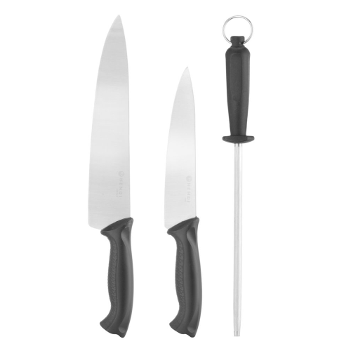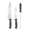 De messen zijn vervaardigd van roestvast staal; het aanzetstaal is gemaakt van carbon staal. Handgrepen van polypropyleen. Set bevat: - Koksmes van 18 cm (afmetingen mes: 180x38 mm, handvat 140 mm, dikte 2,5 mm). - Koksmes van 24 cm (afmetingen mes: 240x50 mm, handvat 140 mm, dikte 2,5 mm). - Aanzetstaal van 23 cm (afmetingen staal: 230x0 mm, handvat 125 mm).