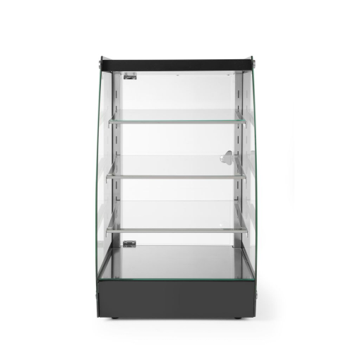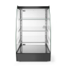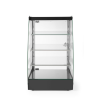 Behuizing gemaakt van roestvast staal, voorzien van gehard veiligheidsglas. Kamercapaciteit: 75L. Voorzien van LED-verlichting aan de bovenkant met aan/uit-schakelaar. Uitgerust met 3 verstelbare glazen schappen. Voorzien van 8 schapinstellingen met een tussenruimte van 45 mm. Zwartgeverfde stalen bodem van de kast met glazen afdekking: 390x325 mm. Onderste glazen schap: 365x250 mm. Middelste glazen schap: 365x230 mm. Bovenste glazen schap: 360x195 mm. Zwartgeverfde stalen bovenkant van de vitrine: 393x325 mm. 5 mm dik zijglas. Geen glas aan de voorkant voor zelfbediening. Magnetische, rechts scharnierende glazen achterdeur, opent slechts aan één zijde. Praktische bodemuitsparing van 260x320x(H)85 mm voor het opbergen van goederen. 4 rubberen, niet-verstelbare poten: 15 mm hoog.