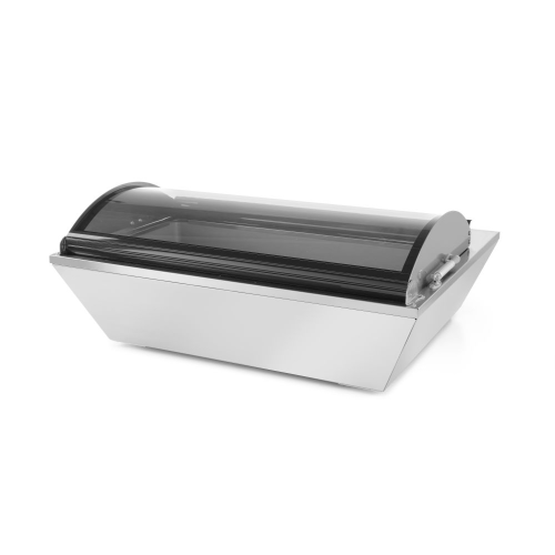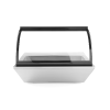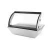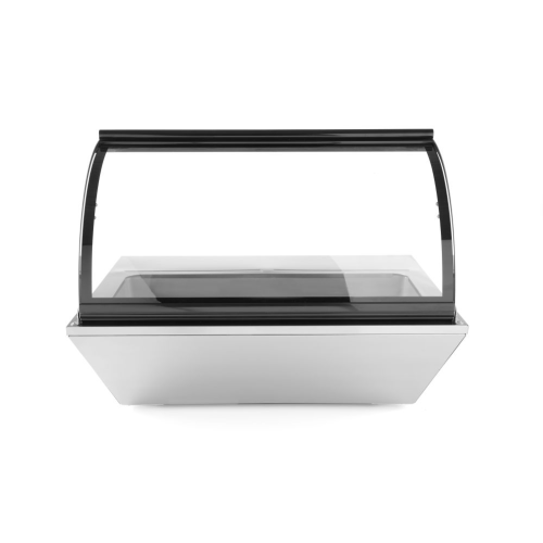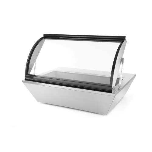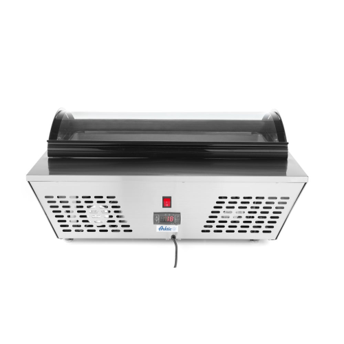 Behuizing van hoogwaardig roestvast staal, voorzien van gebogen glazen kap met gemakkelijk te openen systeem. Geforceerde luchtkoeling met automatische ontdooiing, compressor naast de koelruimte geplaatst. Geschikt voor 8x GN 1/6 GN-containers of 4x GN 1/3 containers (max. hoogte 100 mm), niet inbegrepen. Met 4 verstelbare roestvast stalen poten. Digitale temperatuurregelaar en display. Koelmiddel: R600a. Klimaatklasse: 4. Energielabel: C.