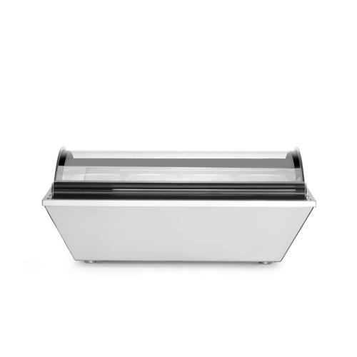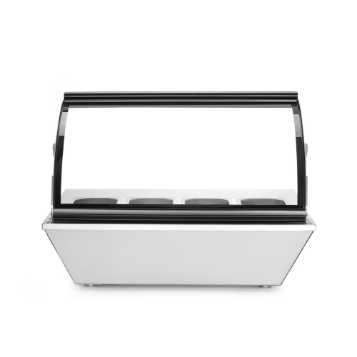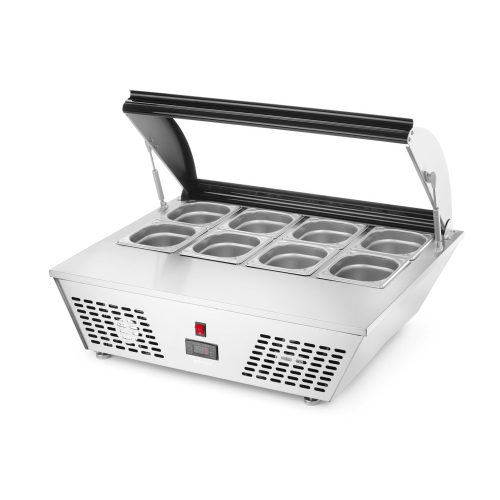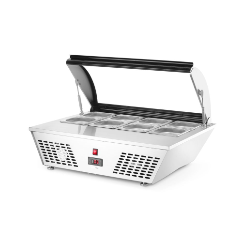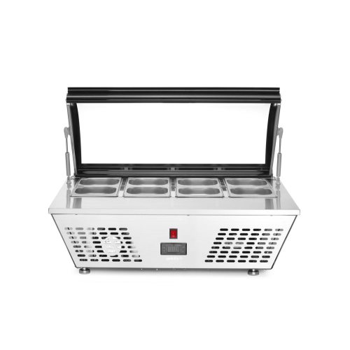 Behuizing van hoogwaardig roestvast staal, voorzien van gebogen glazen kap met gemakkelijk te openen systeem. Geforceerde luchtkoeling met automatische ontdooiing, compressor naast de koelruimte geplaatst. Geschikt voor 8x GN 1/6 GN-containers of 4x GN 1/3 containers (max. hoogte 100 mm), niet inbegrepen. Met 4 verstelbare roestvaststalen poten. Digitale temperatuurregelaar en display. Koelmiddel: R600a. Klimaatklasse: 4. Energielabel: C.