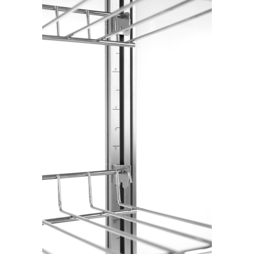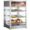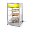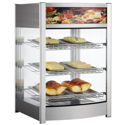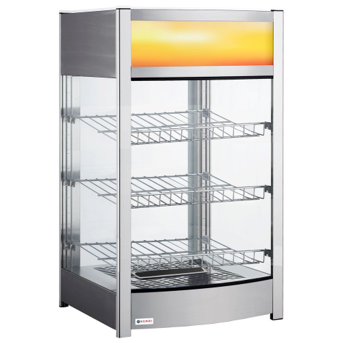 Voorzien van deur aan de achterzijde en gebogen glas aan de voorzijde. Lichtbak met ruimte voor promotiebeelden. Behuizing van roestvast staal. Interne verlichting in het plafond. Inclusief 3 verchroomde schappen, in hoogte verstelbaar 400x335 mm. Waterreservoir voor bevochtiging van de lucht in opzet warmhoudkast. Thermostaat en scherm. Temperatuurbereik: 30°C tot 90°C.