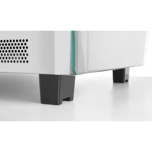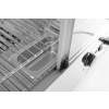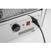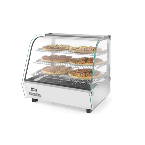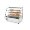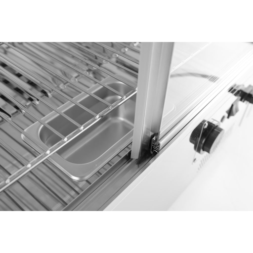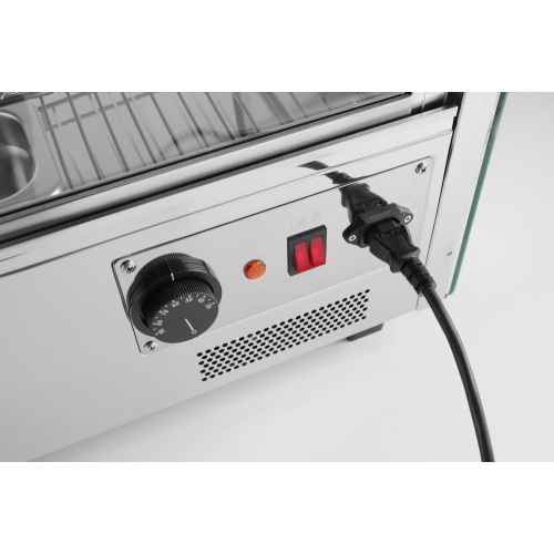 Uitgerust met enkele beglazing en gebogen glas aan de voorkant. Drie niveaus. Twee schuifdeuren aan de achterkant. Gemaakt van roestvast staal. LED-lampje aan de bovenkant van de kamer. Met 3 verchroomde verstelbare planken. Temperatuurregelknop en analoge thermometer. Temperatuurbereik: 30°-90°C.